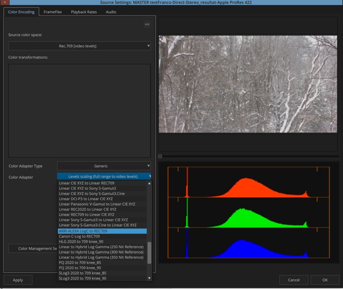 BAC2, BAC3 Fictions - ALEXA mini LF : Color Adapter = ARRI Alexa LogC to rec 709 (dans la section generic).